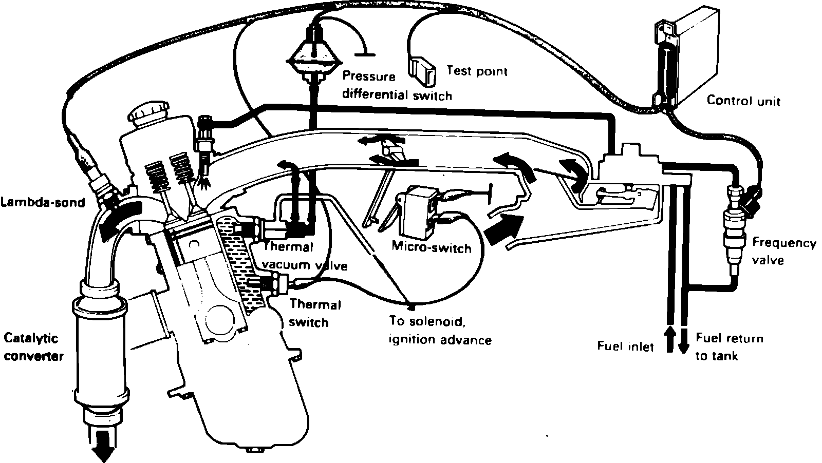 This system, Fig. 1, consists of an electronic control unit, thermal vacuum valve, thermal switch, relay, frequency valve, microswitch, oxygen sensor and a pressure differential switch. This system works in conjunction with a three-way catalytic converter and continuously ``fine tunes'' the quantity of injected fuel into the engine. By fine tuning the injected fuel, more effective combustion can be obtained. When the air/fuel mixture is rich, the oxygen content is low. When the air/fuel mixture is lean, the oxygen content is high. The oxygen sensor is located on the exhaust manifold before the three-way catalytic converter and senses exhaust heat. When hot, the oxygen sensor produces a voltage according to the oxygen content. The electronic control unit senses this voltage and grounds the frequency valve in cycles; this is called the Duty Cycle. The amount of time the frequency valve is grounded depends on the oxygen sensor voltage. The frequency valve controls fuel pressure in the air/fuel electronic control unit's pressure differential valve. The Duty Cycle can be measured by connecting a dwell meter to the test point, Fig. 2. In the event the oxygen sensor becomes damaged, the electronic control unit will operate on a fixed Duty Cycle. Under certain operating conditions, a richer air-fuel mixture is needed. To accomplish this, the system has other components which temporarily ground the electronic control unit, resulting in a fixed Duty Cycle, producing an enriched mixture.