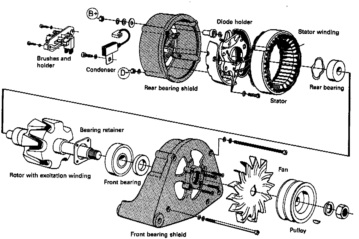 The main parts of an alternator are: