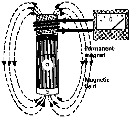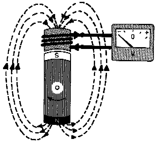The deflections of the voltmeter pointer indicate maximum values after each half revolution. The same effect is obtained regardless of whether the magnetic field remains stationary while the conductor moves or vice versa.