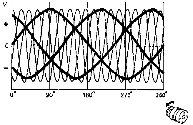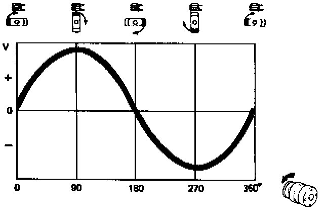 If an oscilloscope is used to register the electrical potential and the rotor is turned at a constant speed, a sine wave curve will be obtained between the max. and min. values.