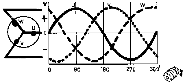 In order to use the alternator as efficiently as possible the stator winding is split into three separate windings spaced 120 degrees apart. The alternating current produced in each winding is called a phase. The three phases are denoted by "u" , "v" , "w".