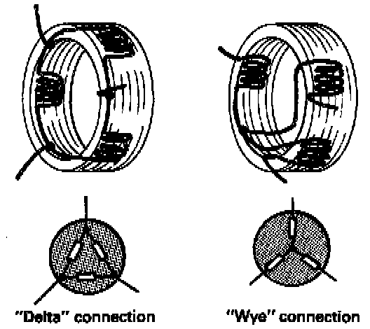 The three windings are joined to each other in either a "delta or a wye" connection. The "delta" type provides a higher potential whereas the "wye" type provides more current without overheating.