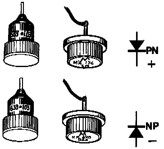 Positive and negative power diodes are used in the alternator to rectify current. They differ from each other in that the rectifying material (silicon) is mounted in the casing in opposite ways. The diode casing is secured in a metal support (heat sink) to facilitate cooling; the heat sink is then connected to the positive or negative terminal of the battery. Positive diodes are called PN diodes and are marked in red. Negative diodes are called NP diodes and are marked in black.