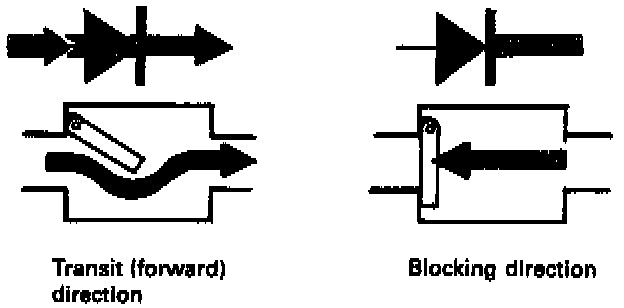 Diodes allow current to flow in one direction only, the direction of the arrow, and block current in the opposite direction. They can be compared to a non-return valve which allows a liquid to flow in one direction only.