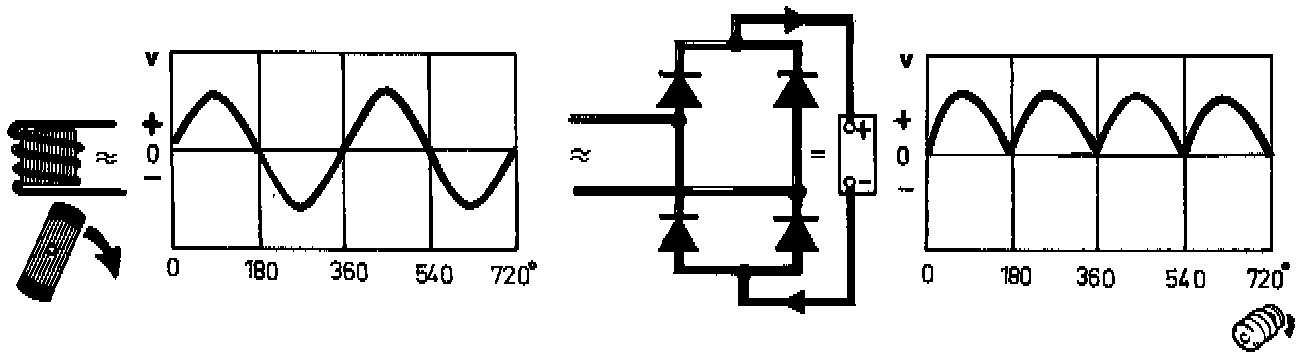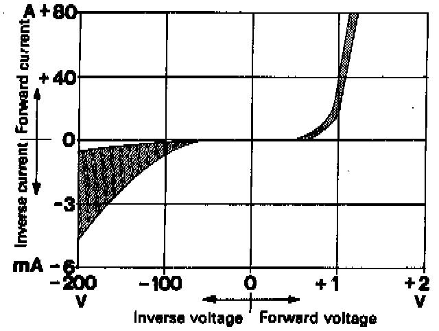 Rectification does not however take place without any losses. At each diode a voltage drop of 0.6 - 1.2 V, depending on the strength of current, occurs. The max. inverse voltage a diode can block is approx. 100 V. If this voltage is exceeded, current flows through and the diode is ruined.
