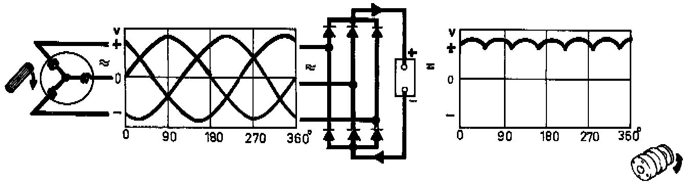 To use the alternating current efficiently full wave rectification is required. This means that each phase must have two diodes, a positive and a negative. A pulsating direct current is still however produced.
