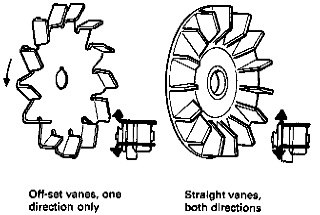 There are two types of fan, one with straight vanes and one with off-set vanes. The off-set type can only be driven in one direction where as the straight type can be driven in either direction.