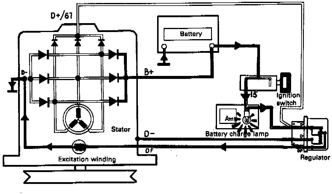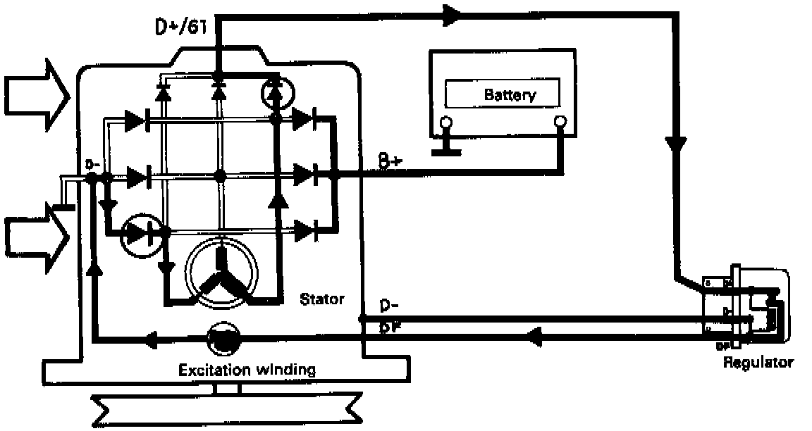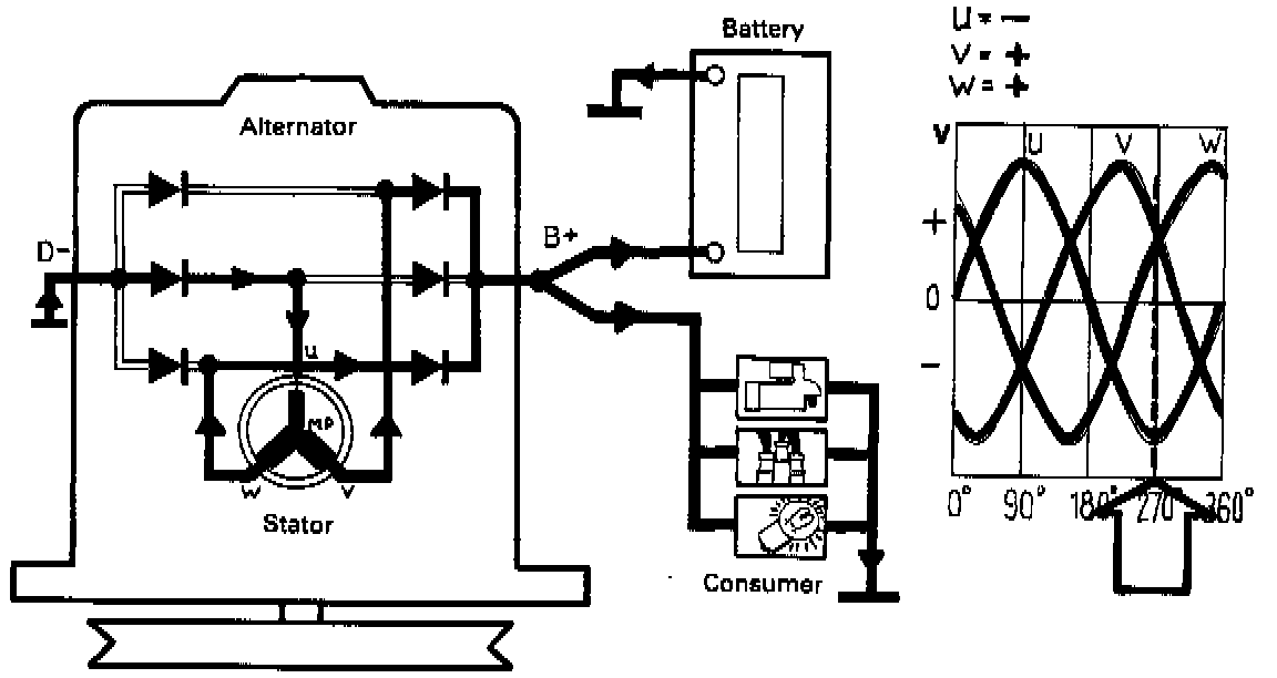 Current for the battery charging circuit and electrical consumers is taken from the B+ terminal on the alternator. The diagram shows that when phase "u" is at a 180° phase angle;