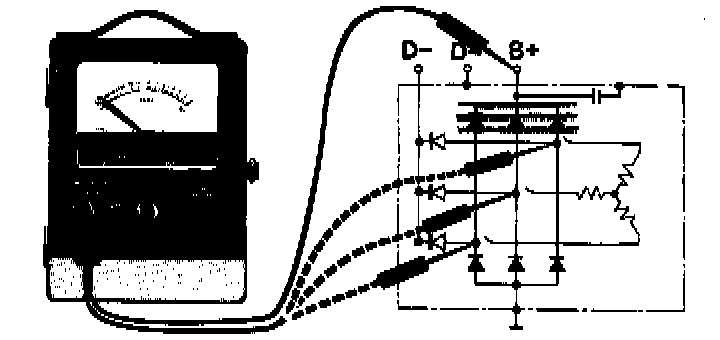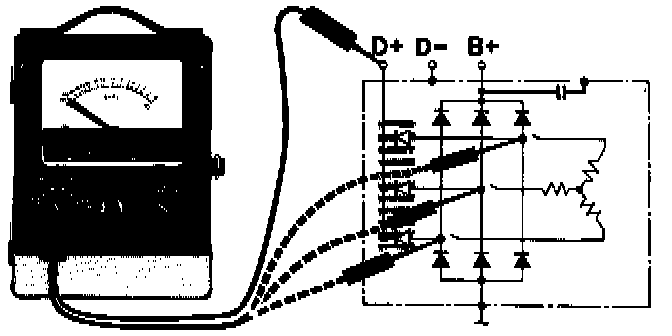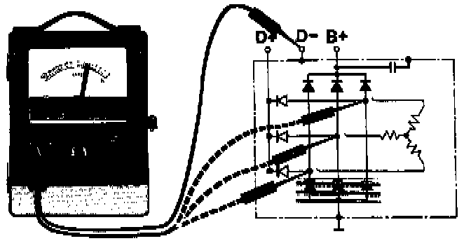 Connect meter probes between B+ and diode terminals, one at a time (3 measurements). Swap probes and take 3 more measurements.