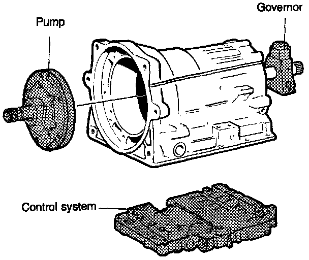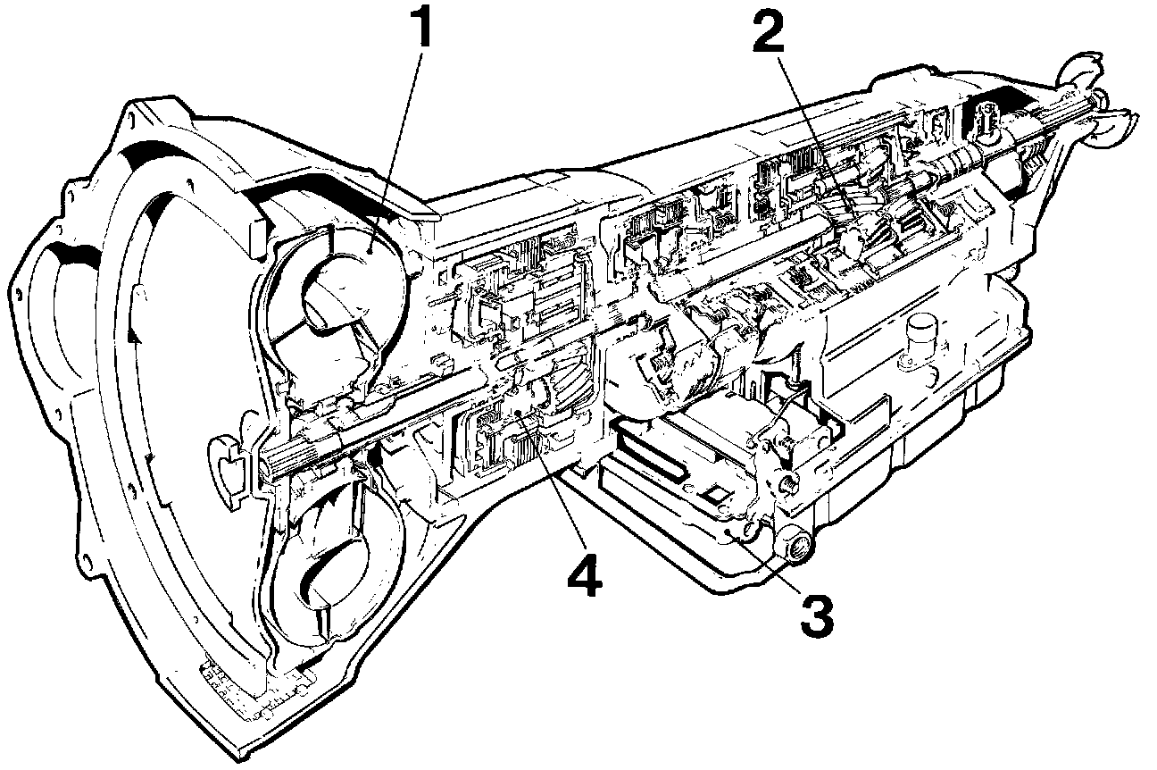Each of the transmissions (all four-speed units) is of the same basic design. The main components are the torque converter (1), three-speed planetary gearbox (2), hydraulic control system (3) and overdrive (4th gear) unit (4). However, some differences do exist between the various types.Transmission Assembly: