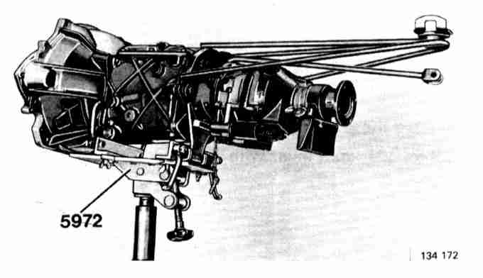 1. Place transmission on fixture P/N 5972. Fixture should be in its rear position. Tighten fixture bolts carefully.