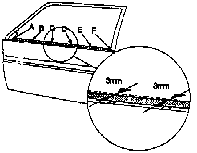 The clearance between the weatherstrip and window must be correct to ensure correct window travel speed. The window may stick if the clearance is too small. When replacing a side door, the weatherstrip flange should normally be bent slightly. However, if the flange is straight when the door is delivered, the correct alignment can be achieved by bending it outward as follows: