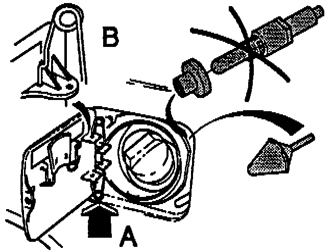 The earlier type of spring-loaded opener has been discontinued and replaced by rubber stops. If replacement becomes necessary, replace both openers and transfer hinge spring (A) to the hole behind the hinge mounting (B).