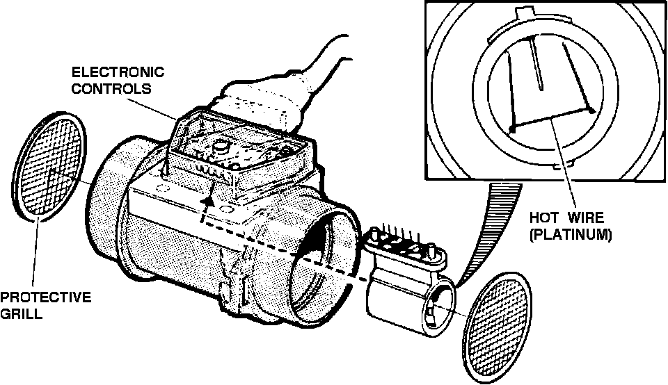 The measurement sensor (inside the meter housing) consists of a wire (hot-wire) which is maintained at 215°F (100°C) higher than the air entering the engine. As the air mass passes over the hot-wire, wire resistance decreases and more current is required to maintain the correct temperature. The amount of current required is used to calculate the air mass entering the engine.