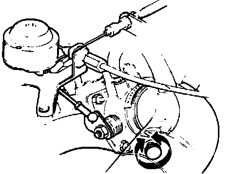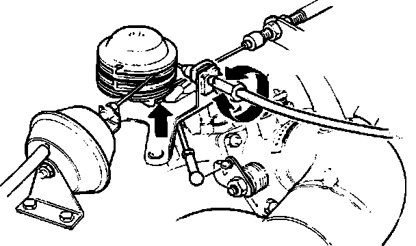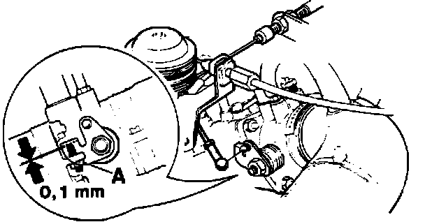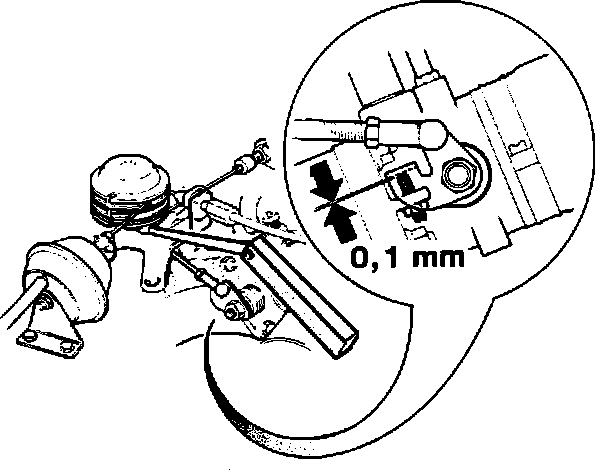 10. Place a 1 mm (0.04 in) feeler gauge between throttle pulley and idle speed stop.Clearance between throttle lever and adjustment screw should now be 0.1 mm (0.004 in). Adjust link rod as needed.