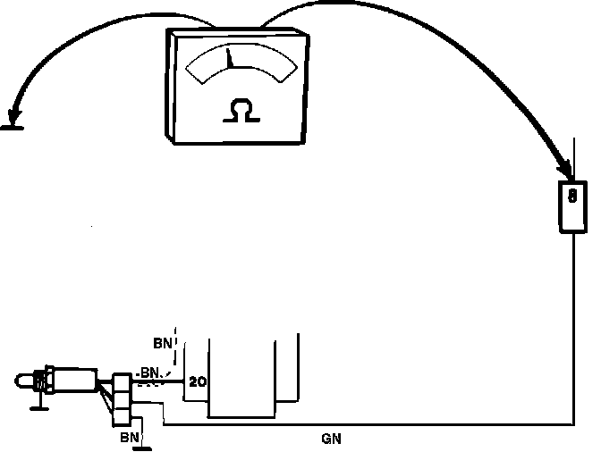6. To check the oxygen sensor (lambda sond) pre-heating element, connect an ohmmeter between terminal #8 in 20-pole connector (located next to right side A-post) and ground.