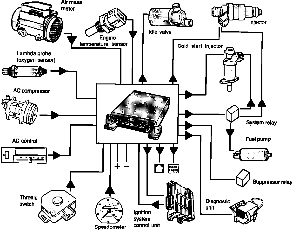 The Electronic Control Unit (ECU), located in passenger side kick panel, has a microprocessor that receives signals from various input devices regarding engine operating conditions. This information will be evaluated in relation to pre-programmed values and it calculates the optimal injector frequency (opening duration) to provide optimal air/fuel mixture, performance, driveability and emissions output.