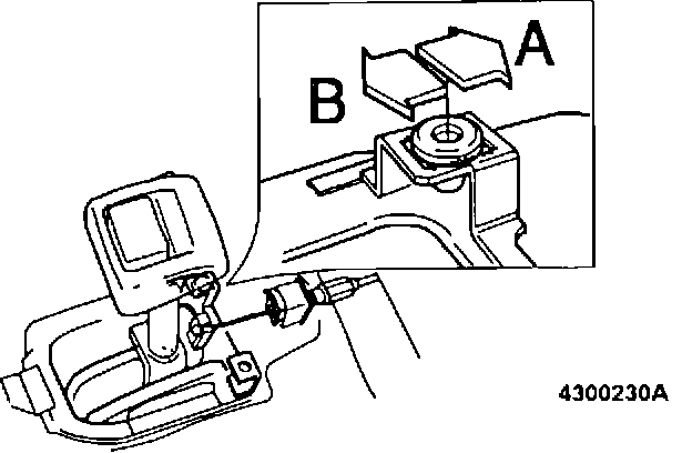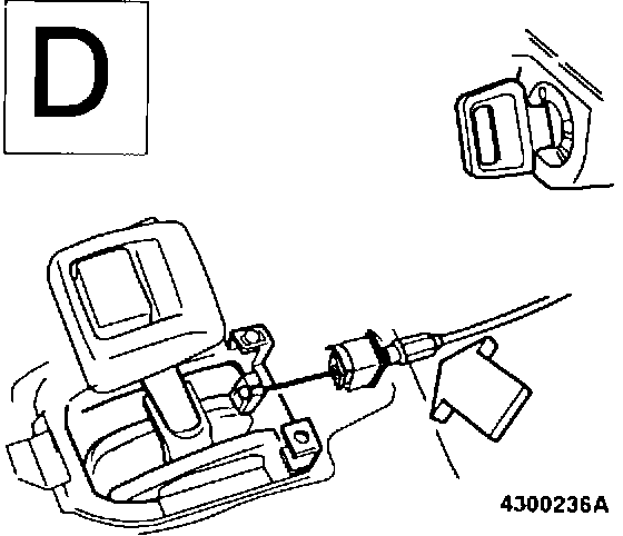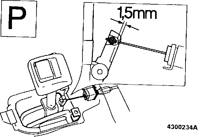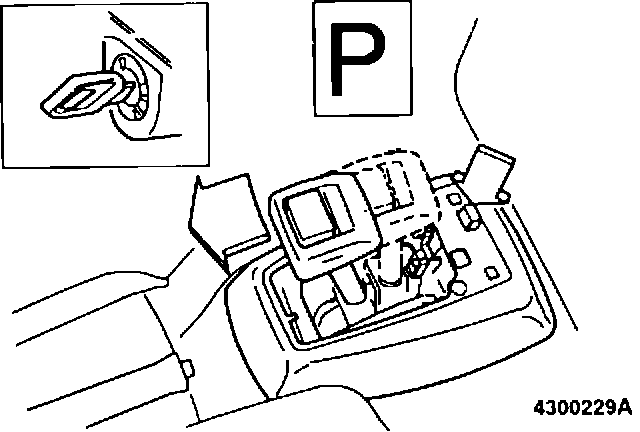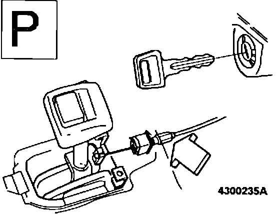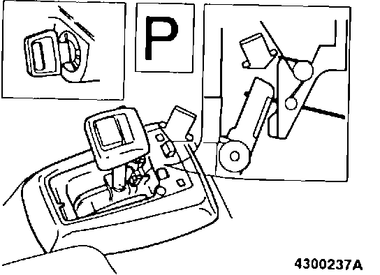 Operate override button. It should now be possible to move lever from position P. If lever cannot be moved, clearance between override lever and key lock arm is excessive. To correct, adjust position of housing as per (A18).