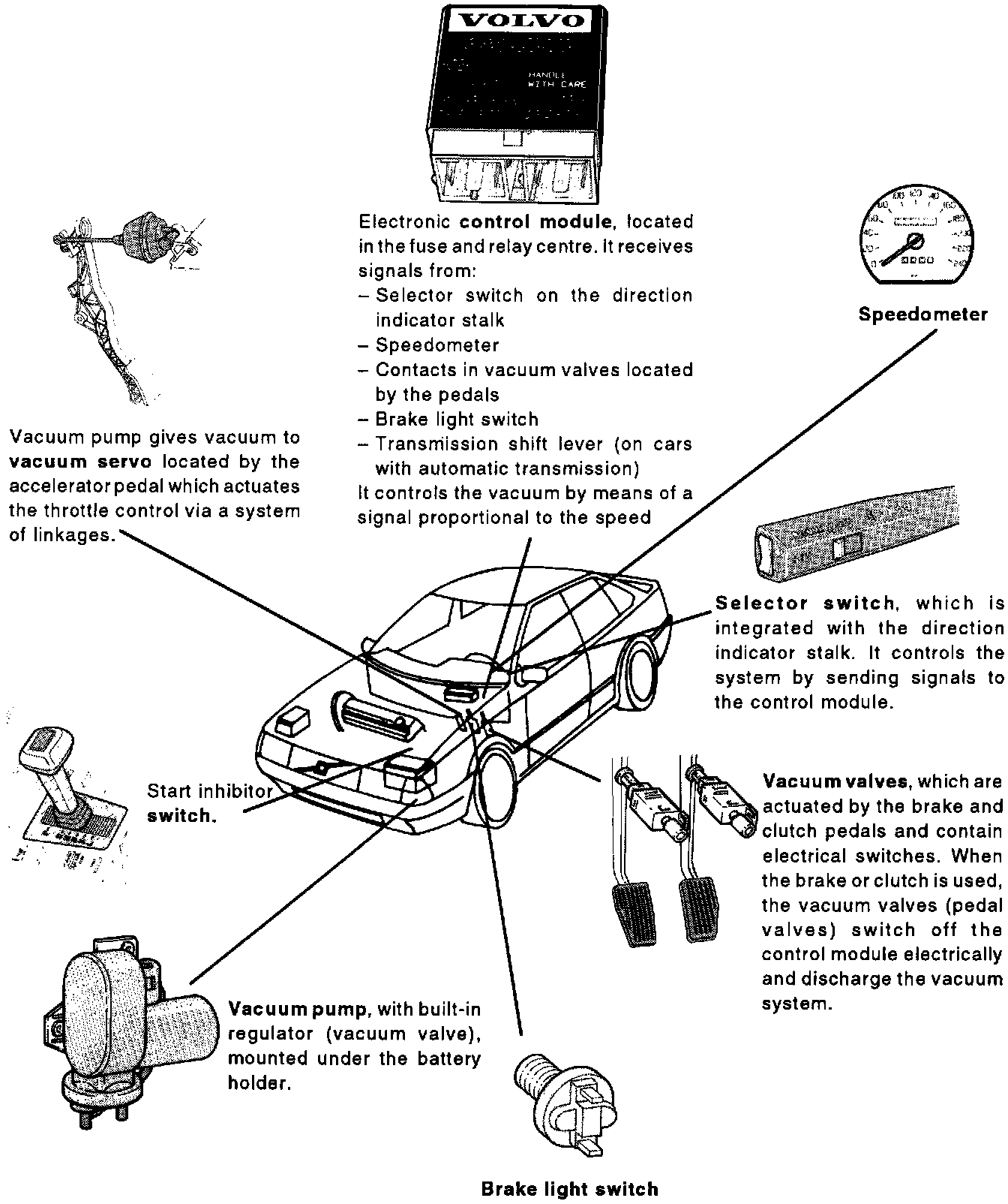Design and functionThe different sensors feed input signals to the control module microcomputer, which decides on the value and status of the input signals. After approving these, a relay in the control module is connected and feeds voltage to the vacuum pump and regulator. For continued use, the control module monitors and operates the system for optimal function.