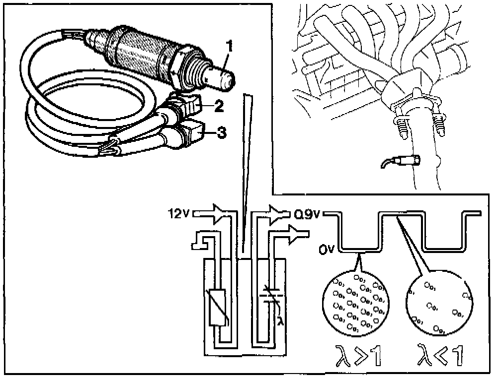 When the engine is running rich, the oxygen content of the exhaust gases is low or zero and the output signal is approx. 0.9 V.