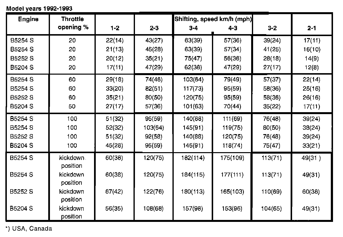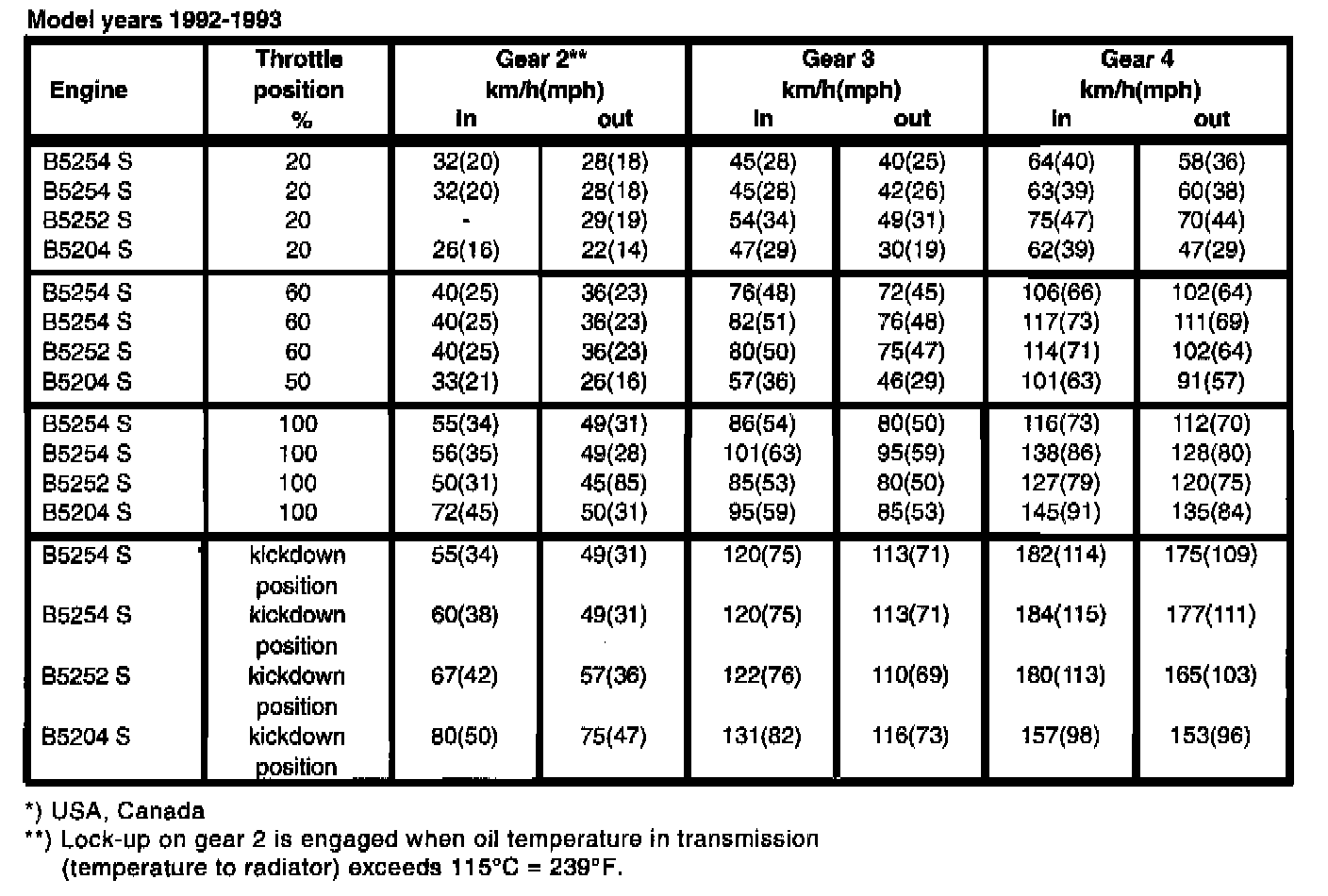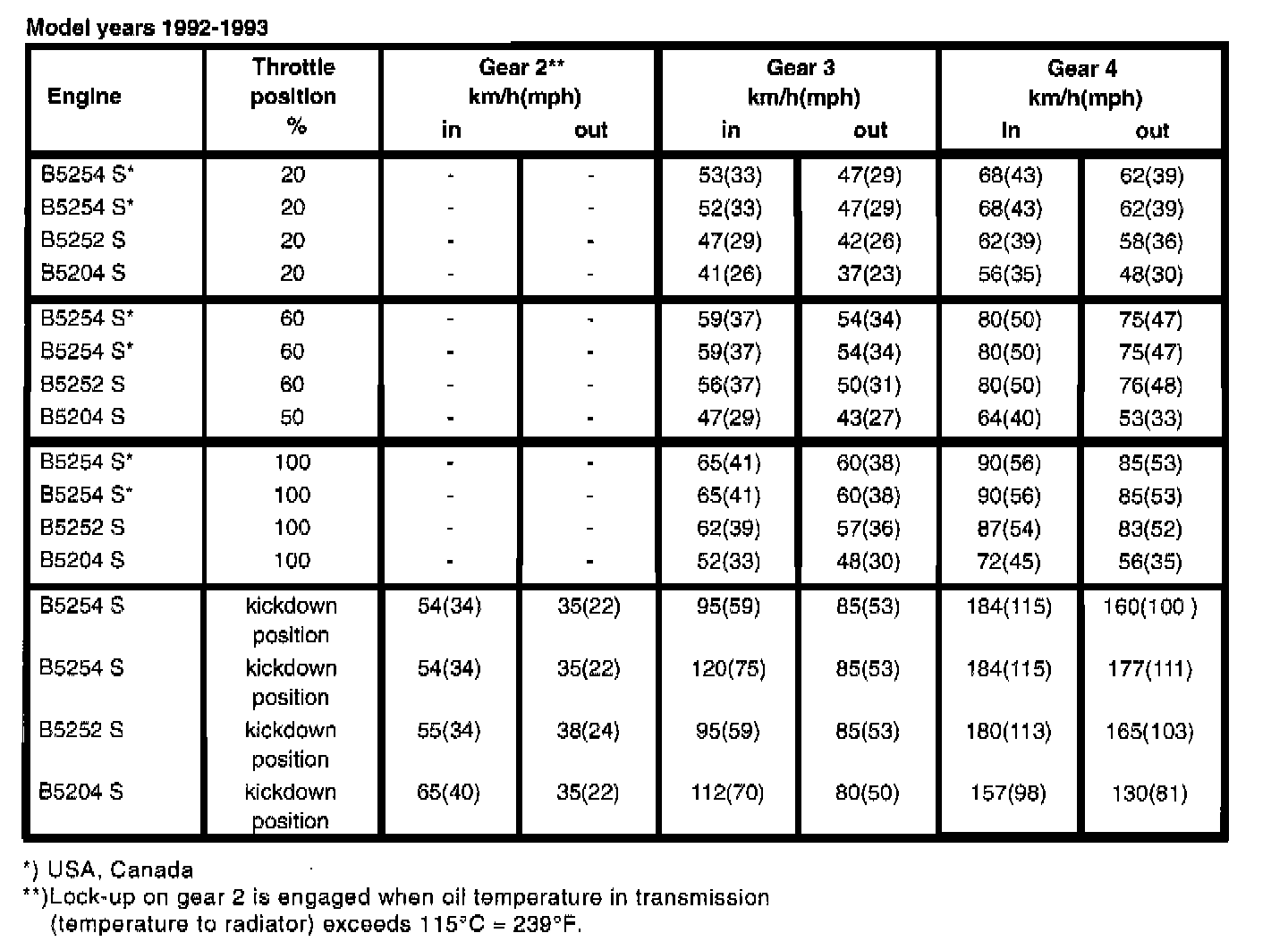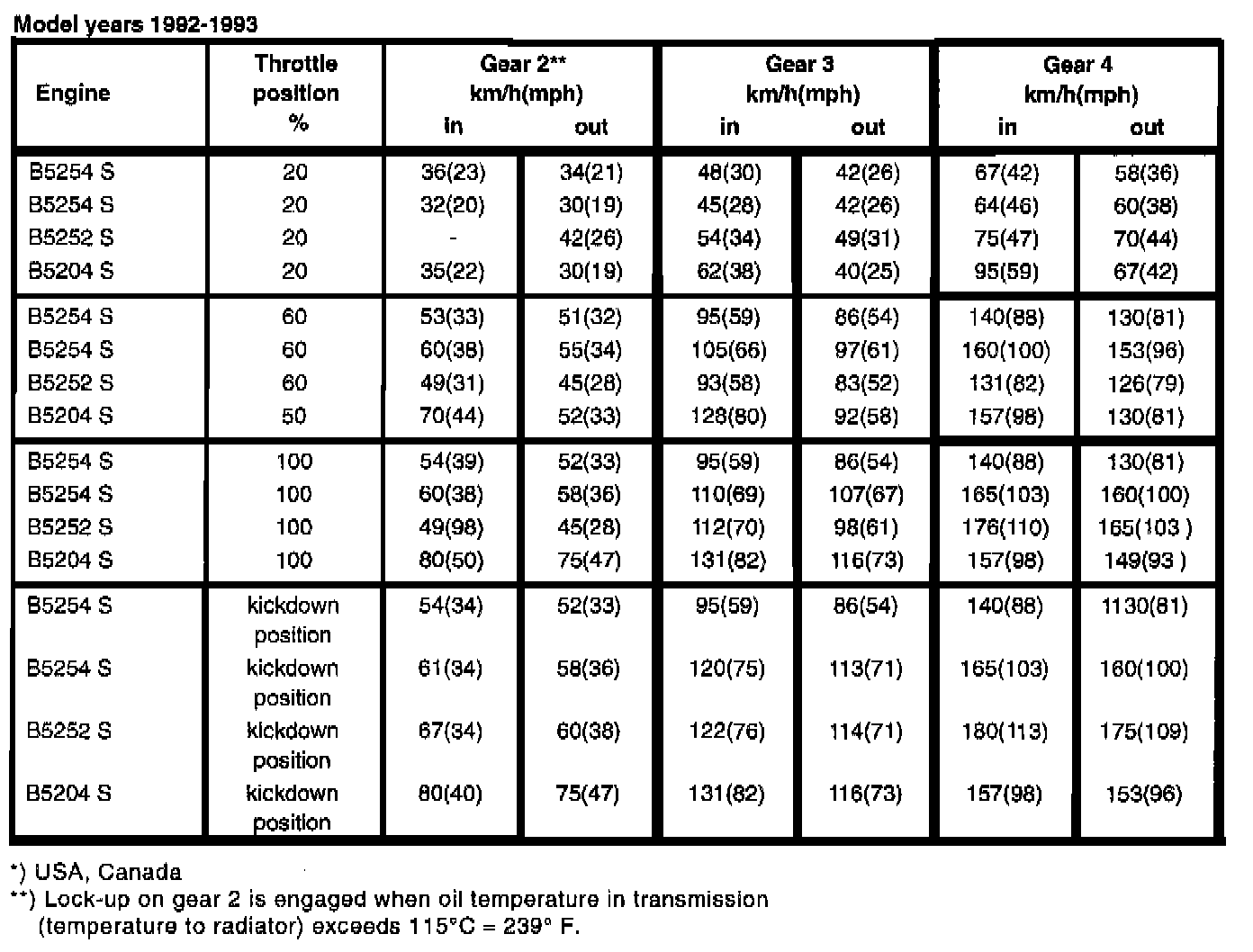 TRANSMISSION SHIFT SPEEDS, km/h (mph)