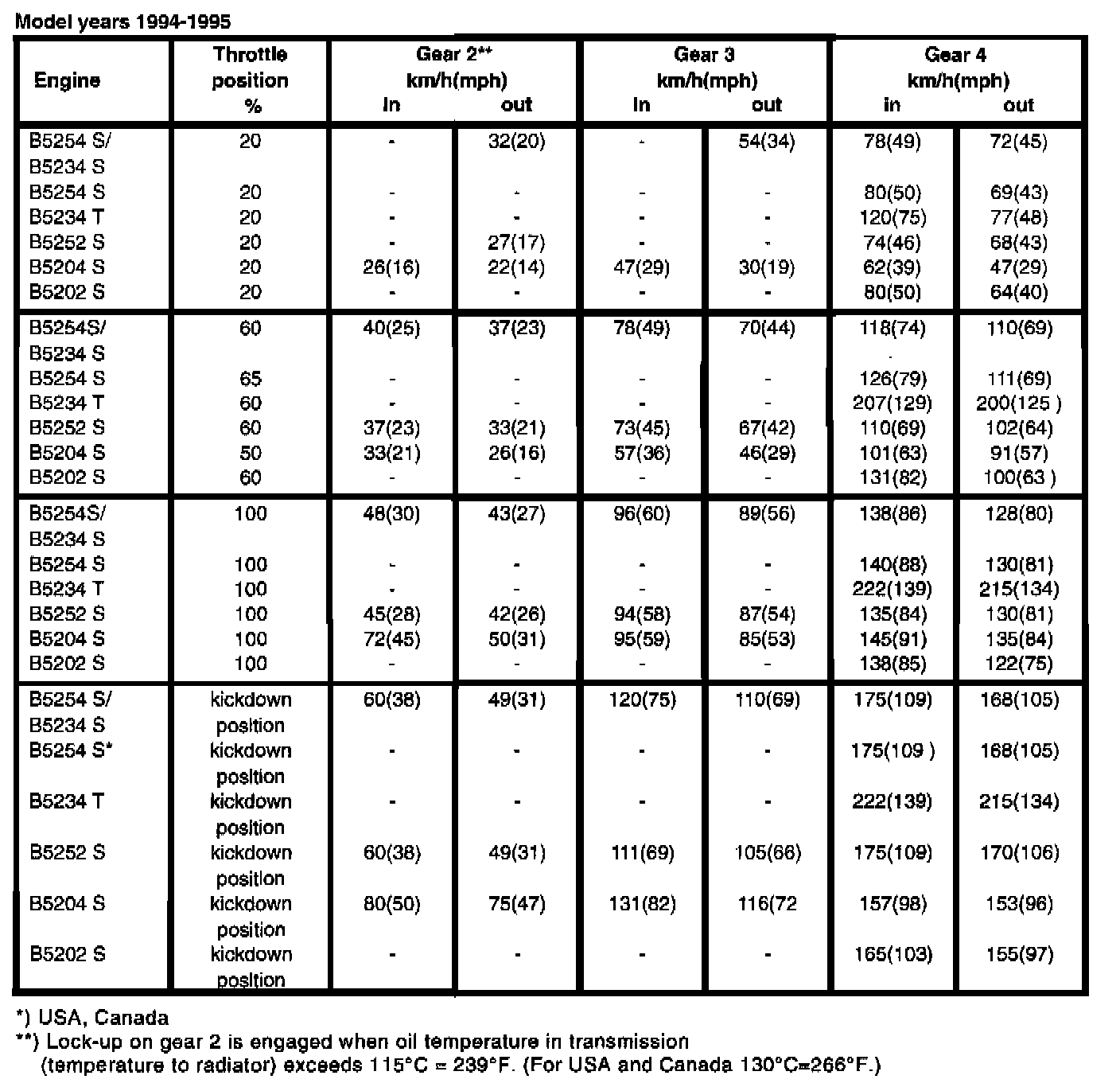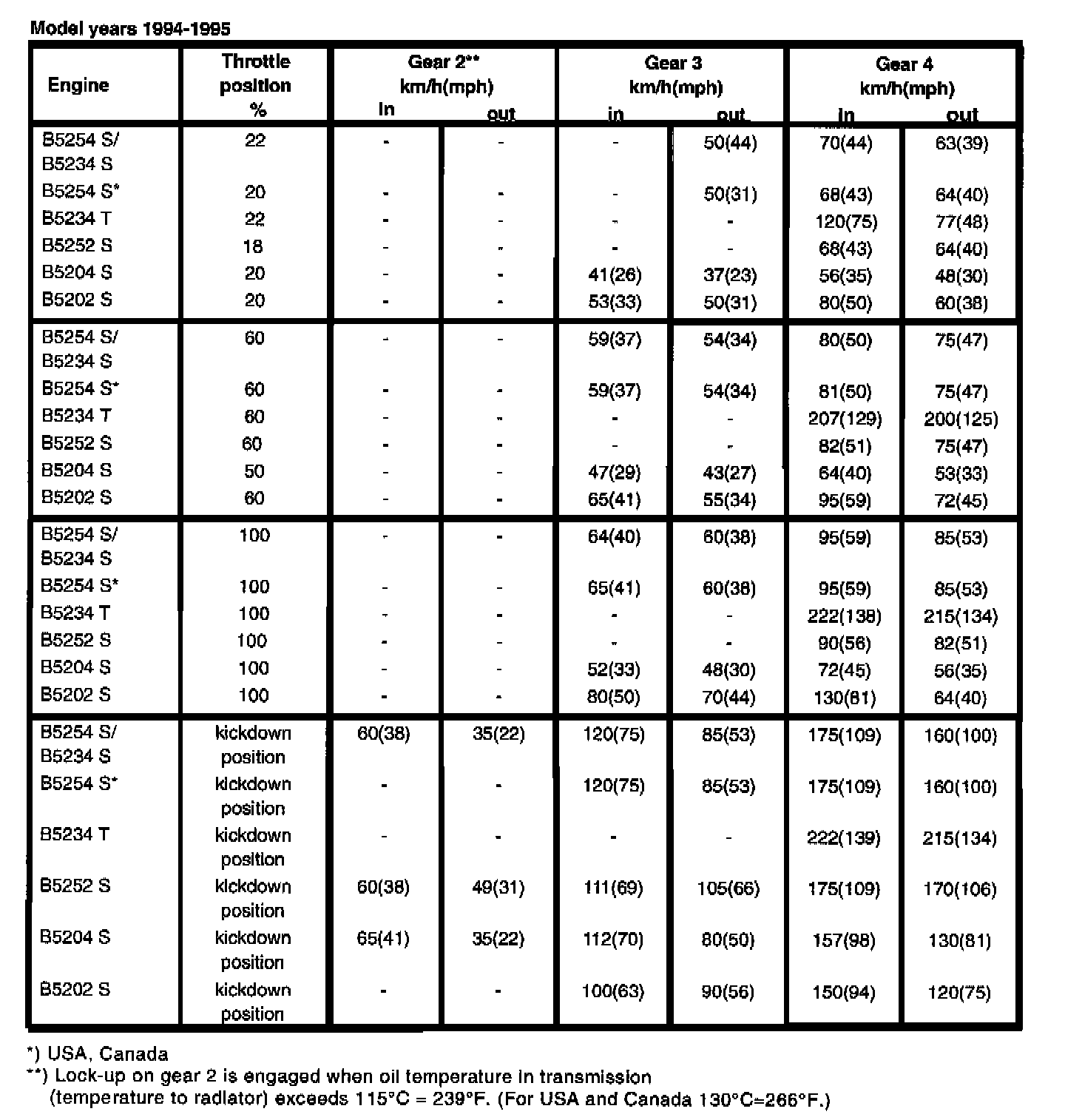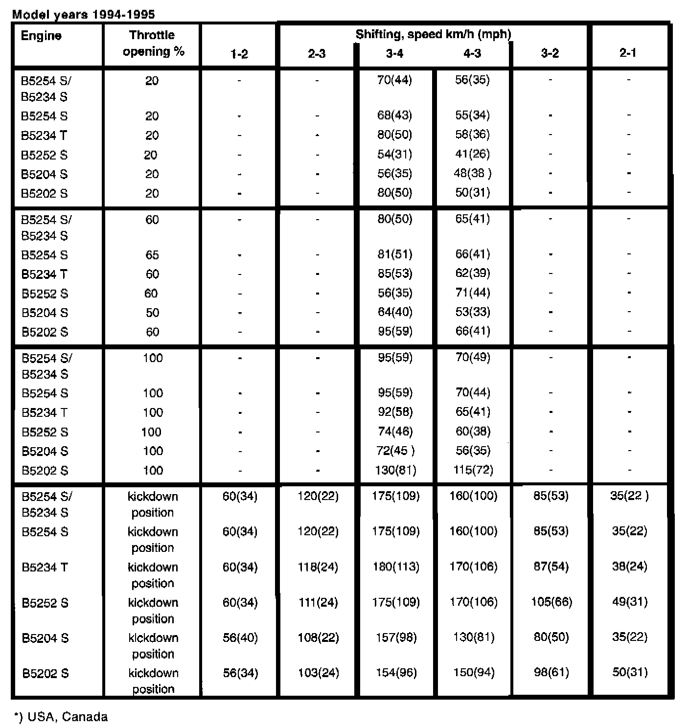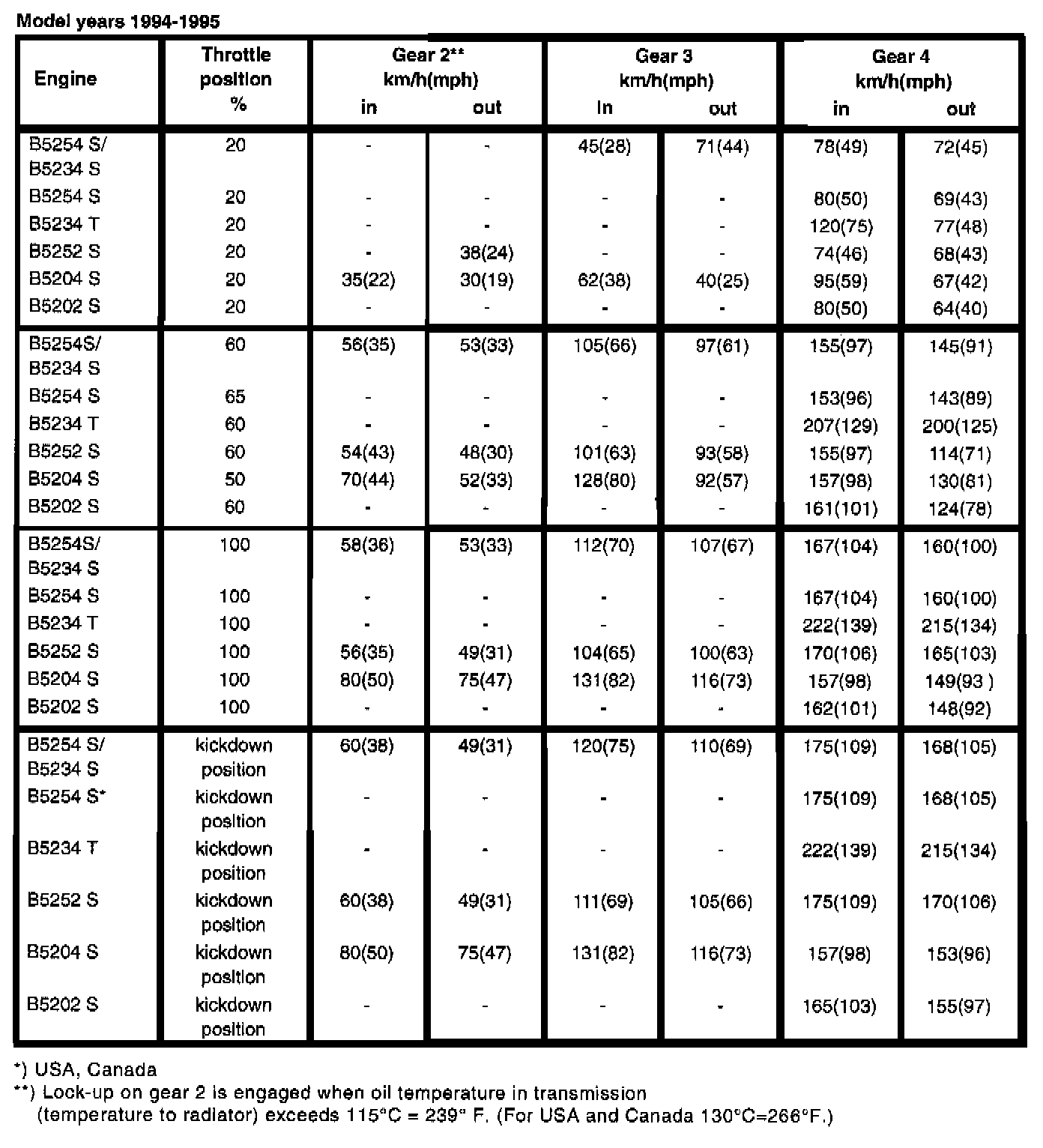 The AW 50-42 automatic transmission is equipped with a 'mode selector" with three different driving modes: Economy, Sport and Winter. Depending on the selected mode, shift speeds are determined and mechanical lock-up engaged at different speeds. Below are the shift speeds for the three driving modes together with the engine types and model years at selected throttle openings. Set gearshift selector to position D. When test driving, the speeds in the tables should be used as a guide since it is not possible to take an exact reading of speed and throttle position during actual driving.