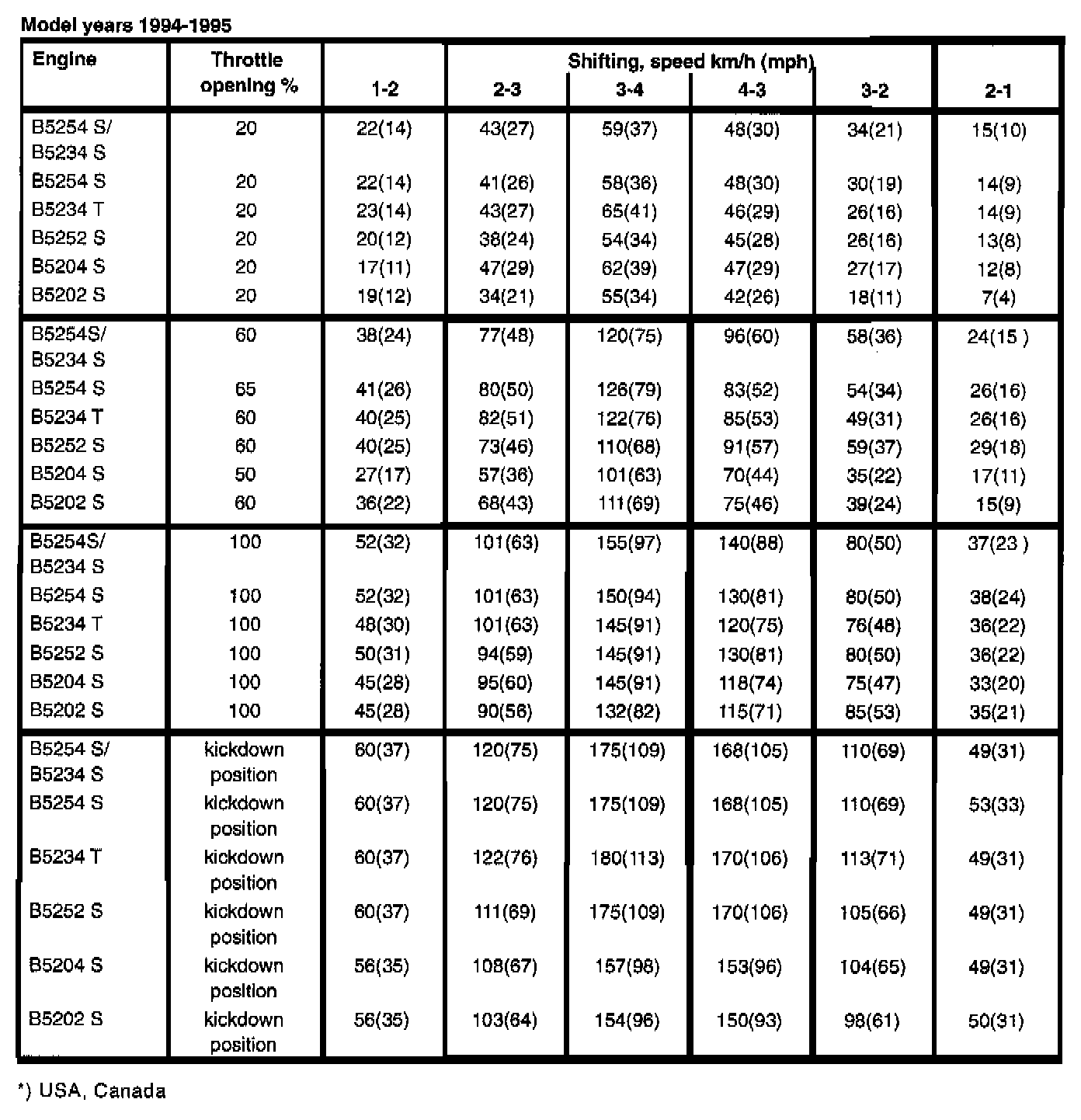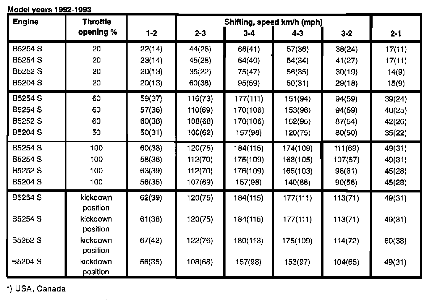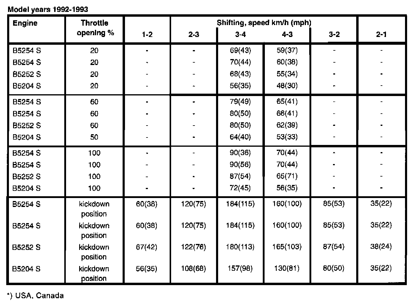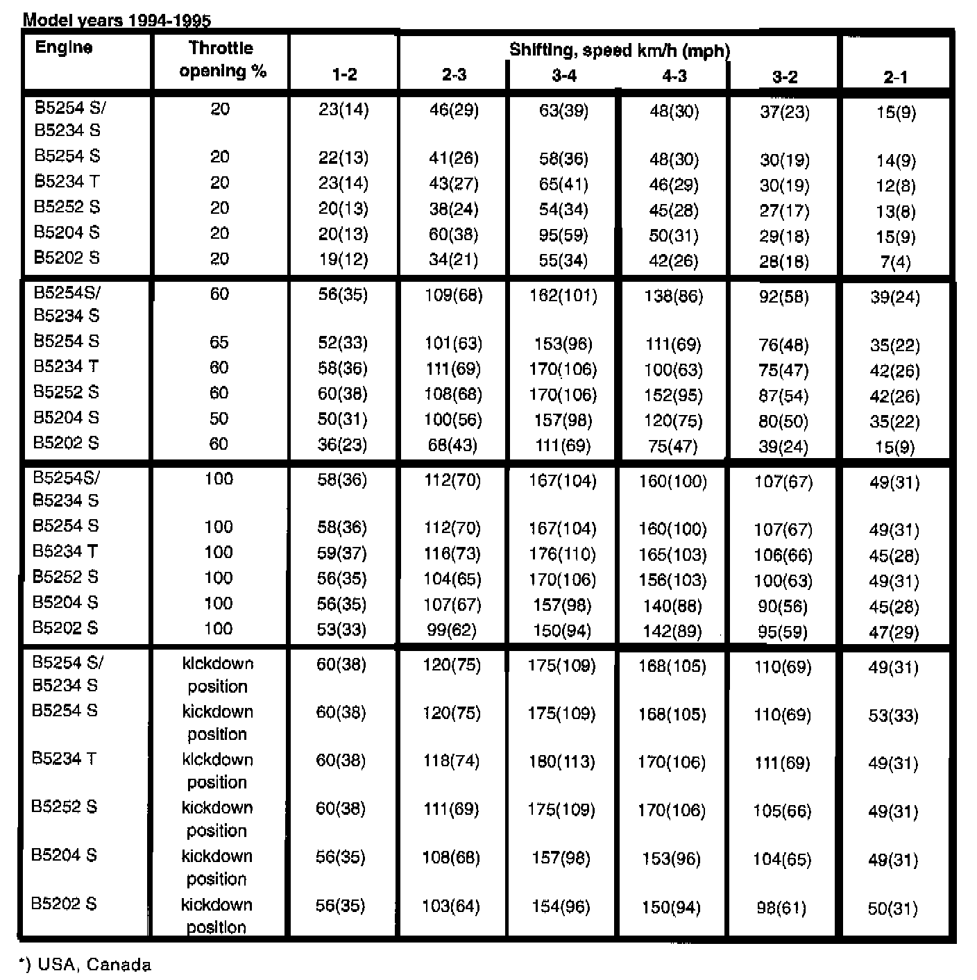 The AW 50-42 automatic transmission is equipped with a 'mode selector" with three different driving modes: Economy, Sport and Winter. Depending on the selected mode, shift speeds are determined and mechanical lock-up engaged at different speeds. Below are the shift speeds for the three driving modes together with the engine types and model years at selected throttle openings. Set gearshift selector to position D. When test driving, the speeds in the tables should be used as a guide since it is not possible to take an exact reading of speed and throttle position during actual driving.