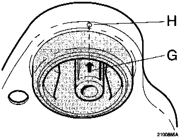 - Install bushing loosely with arrow (G) opposite the recess (H) in the torque control arm bracket.