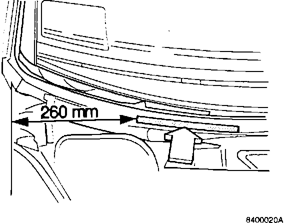 - Measure off 260 mm from inner edge of each front fender along bottom of windshield frame.