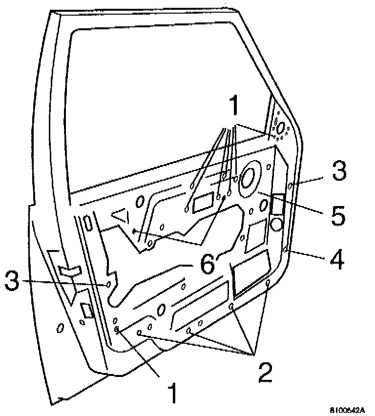6. Punch marks on markings (6). Drill square 9 x 9 mm (23/64" x 23/64") holes for box nuts P/N 946947-9.