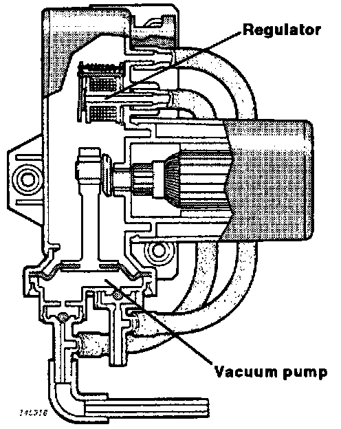 Vacuum pump and regulatorOn a given signal from the control module, the vacuum pump and regulator control the negative pressure in the tube leading to the vacuum servo which is attached to the throttle linkage.