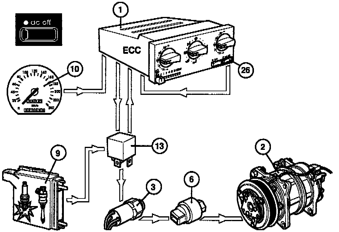If the A/C is switched off using the "ac off" switch (26), the ECC control module will cease to supply the relay and the compressor will stop. However, this does not apply when the air distribution control is in the defroster setting, since the A/C is always on in this case.