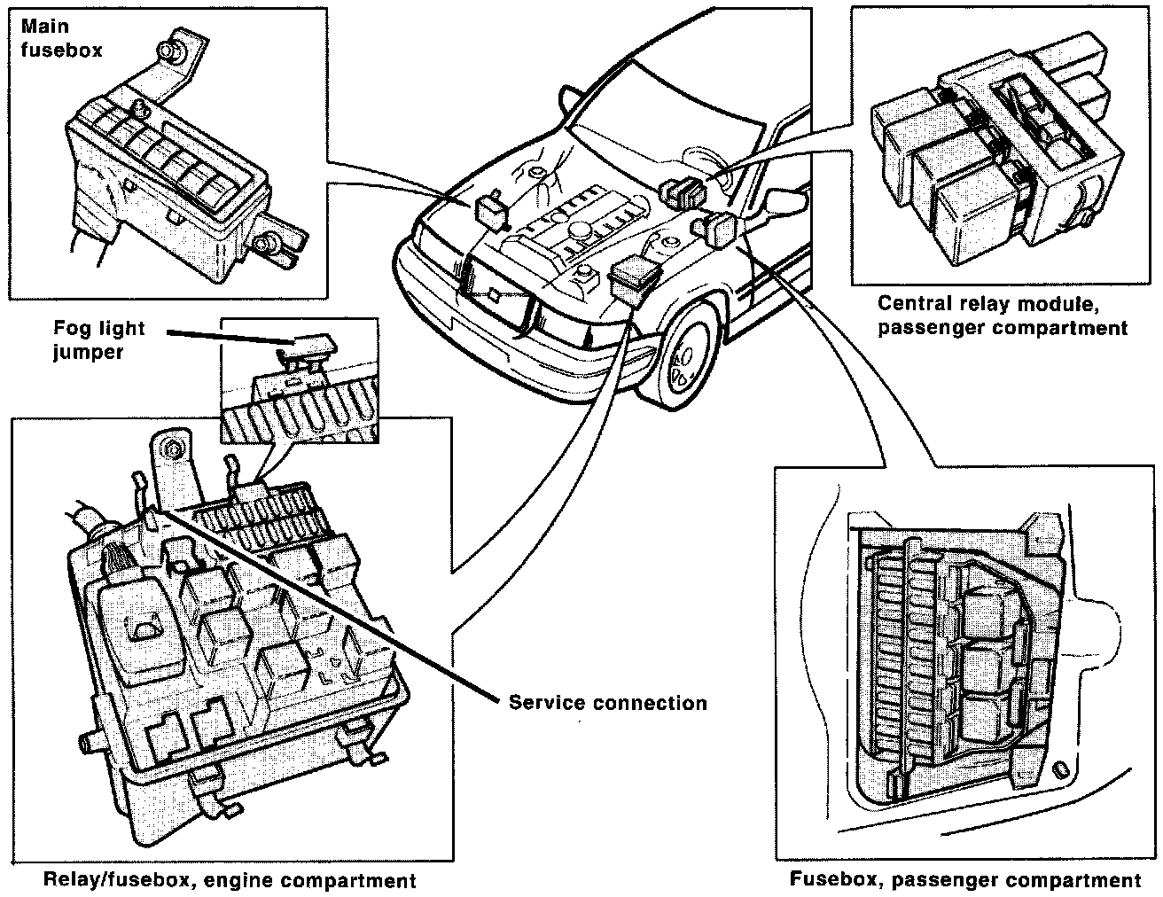 The main fuse is called the A-box, the relay-and fusebox, the B-box, the fusebox in the passenger compartment, the C-box and the central relay module in the passenger compartment, the D-box. The wiring diagram thus indicates the various fuses as, e.g., A2, B5 in order to designate fuse 2 in the main fusebox and fuse 5 in the relay-and fusebox in the engine compartment, respectively.