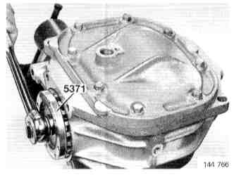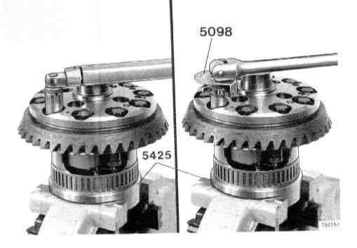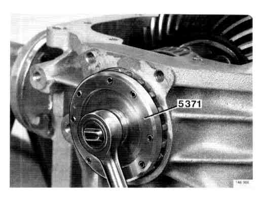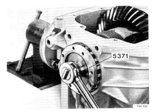 Use wrench 5371. Tighten nuts until small backlash is felt at crown wheel and dial gauge just begins to indicate.