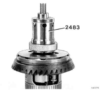 7. Remove differential bearings and locking plate with puller 2483. Note bearing locations to ensure that bearings are reinstalled in the same position.