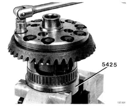 8. Remove crown wheel from [1][2]differential. Use counterhold 5425. Mount counterhold in vice and mount differential on counterhold.