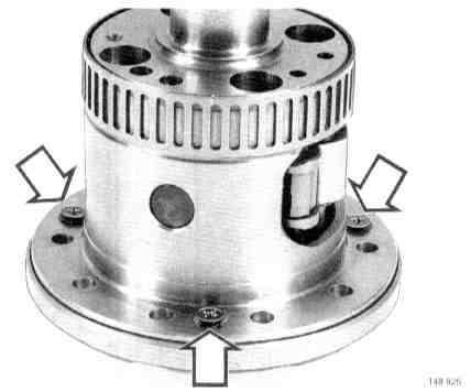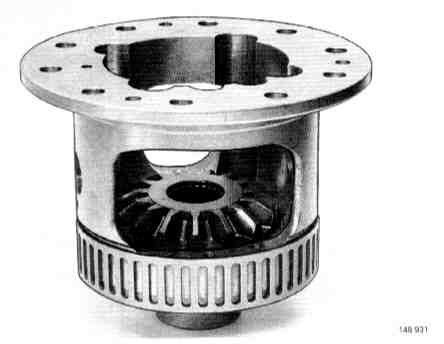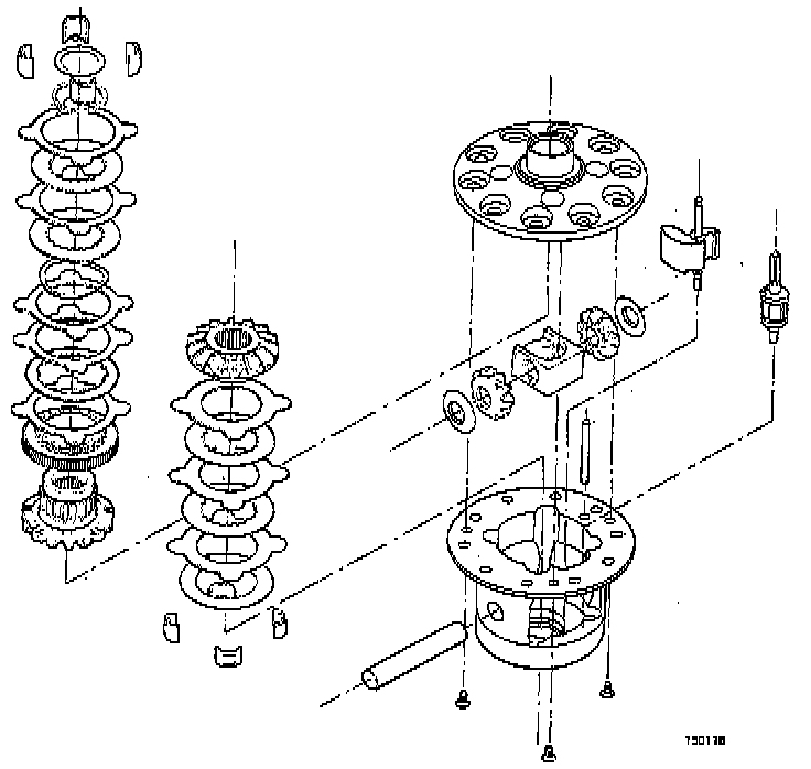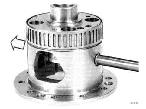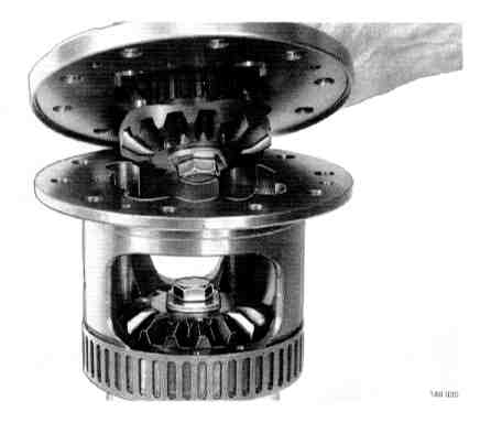 10. Lift out [1][2]differential gear on crown wheel side, complete with plate assembly, guides and adjusting washer (if not already removed with end plate).