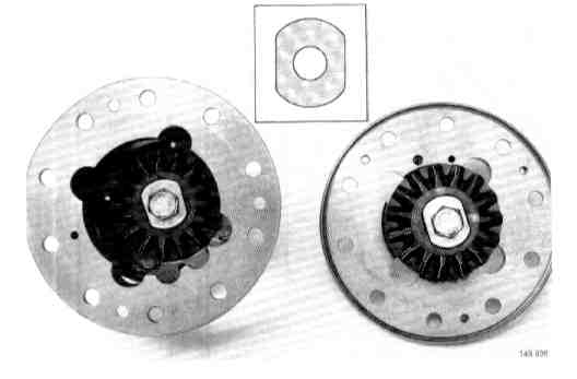 17. Install plate assembly on inner [1][2]differential gear. Use grease to hold guides in position on plate assembly.