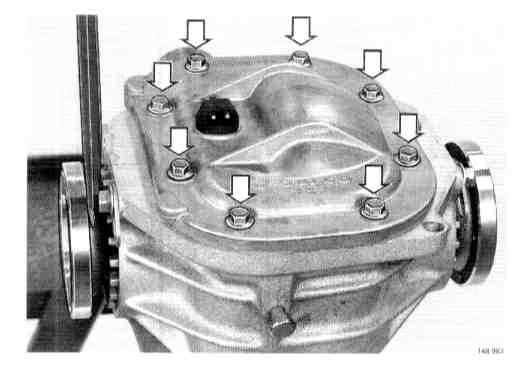 9. Slacken three bolts securing [1][2]differential housing to flange.