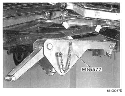 The compression tool off-loads pressure on the component parts in the suspension when carrying out removal/installation operations. The tool is attached to the rear axle member, which means that it has no affect on the stability of the hoist during work.
