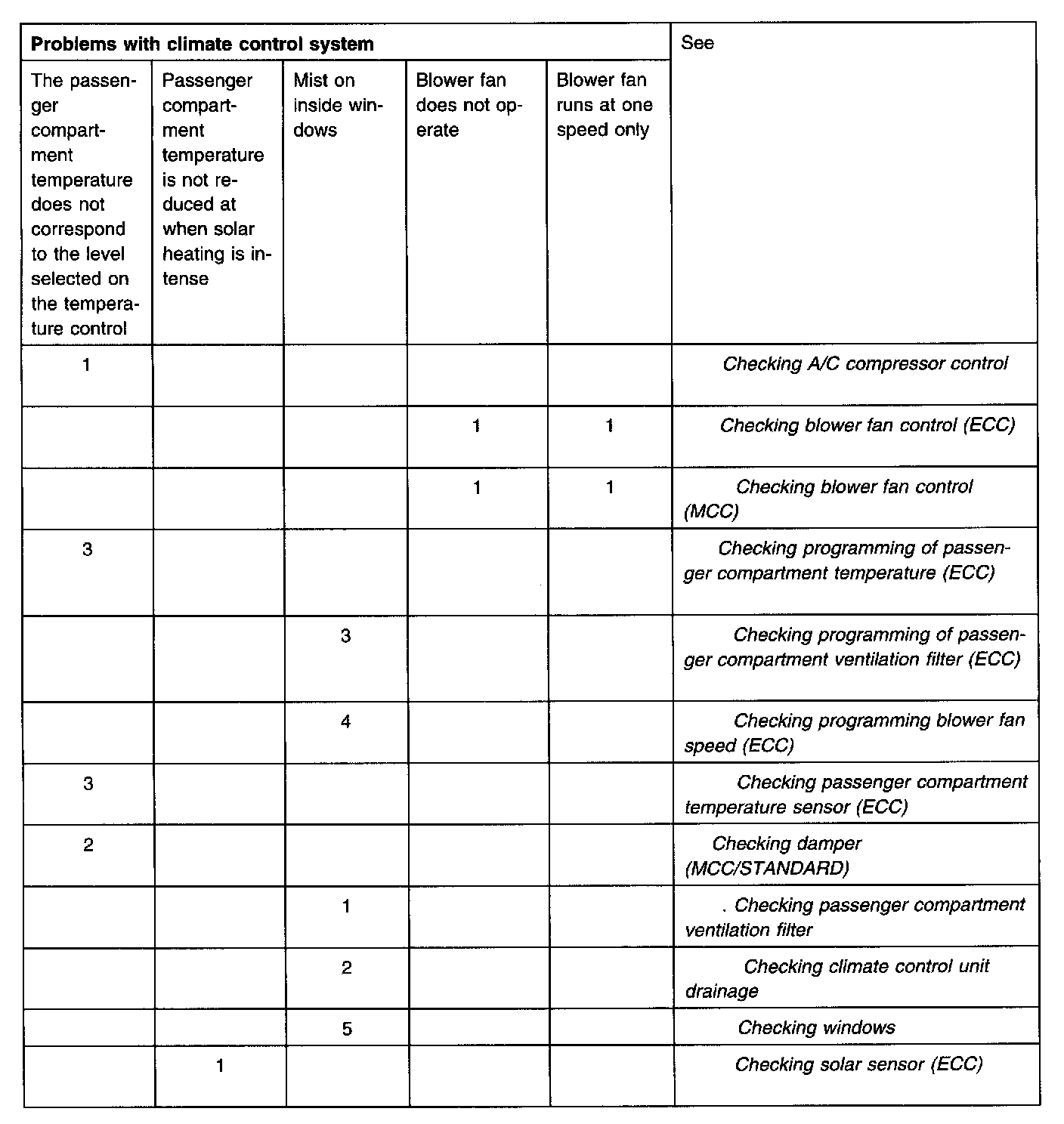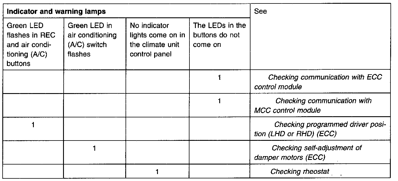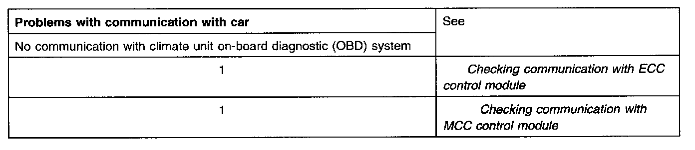 Table of symptoms; Problems with climate control system, Problems with communication with the car, air conditioning (A/C) problems