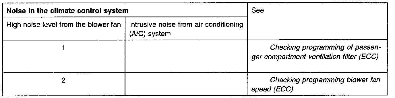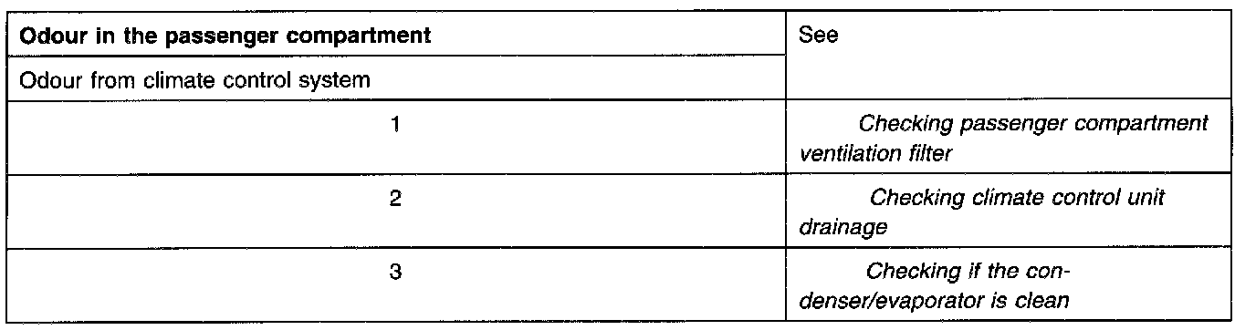 Table of symptoms; Indicator and warning lamps, noise in climate control system, odor in the passenger compartment