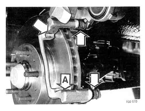7. Inspect for corrosion or dirt between upper sliding plate and caliper retainer. Clean as required. Inspect that upper sliding plate are in position in piston housing and caliper retainer. Remove lower sliding plate. If fitted (see arrow A). Inspect guide pin dust seal. Replace seal if in poor condition.