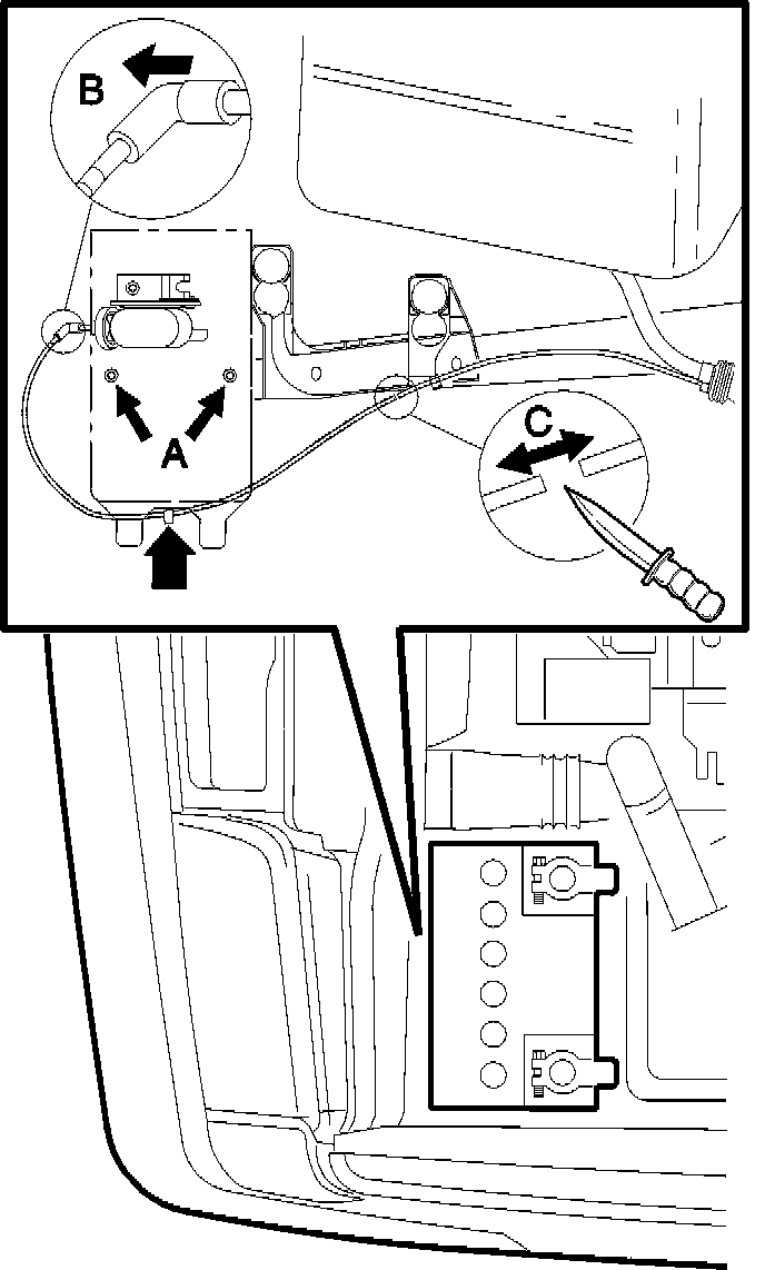 Cut the black vacuum hose (C) located under the air cleaner box at the spring strut, discard the place of hose.