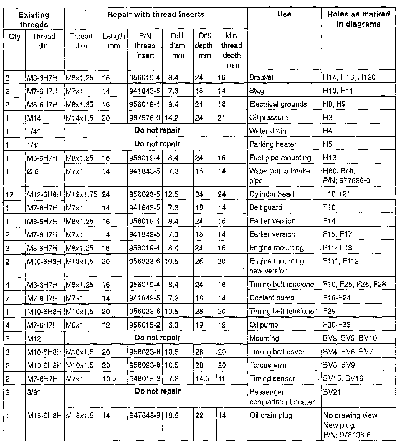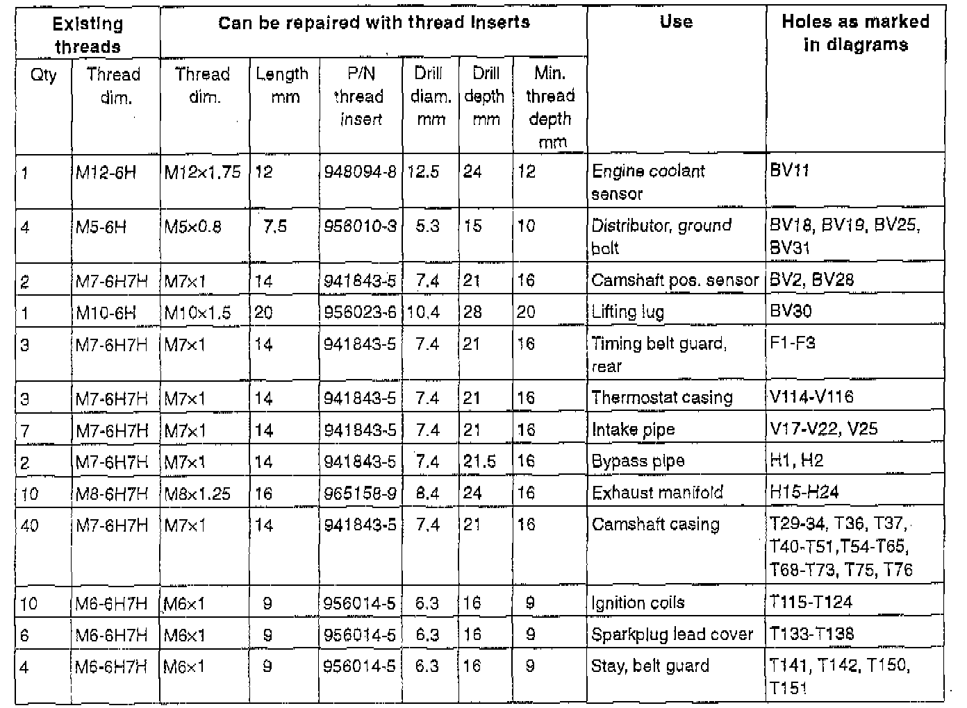 - The table below shows which threaded holes in the cylinder head and camshaft casing can be repaired and which thread inserts to use.