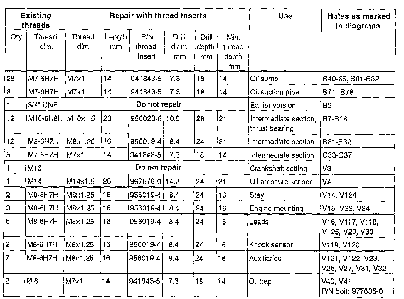 NOTE: Repairing of internal threads in cylinder block, intermediate section and cylinder head is done with the aid of thread inserts. Some threaded bores cannot be repaired in this way, as there is insufficient body in the threads. (The tables below also list bores which should not be repaired.)