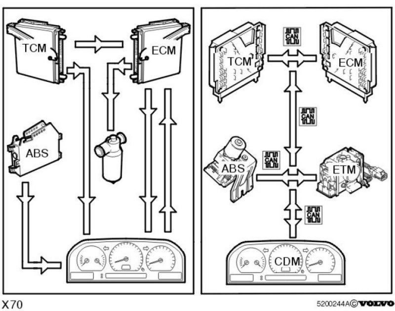 In the S/V70 models communication has previously been on the "one signal - one cable" principle which requires a large number of cables between the different control modules/components.