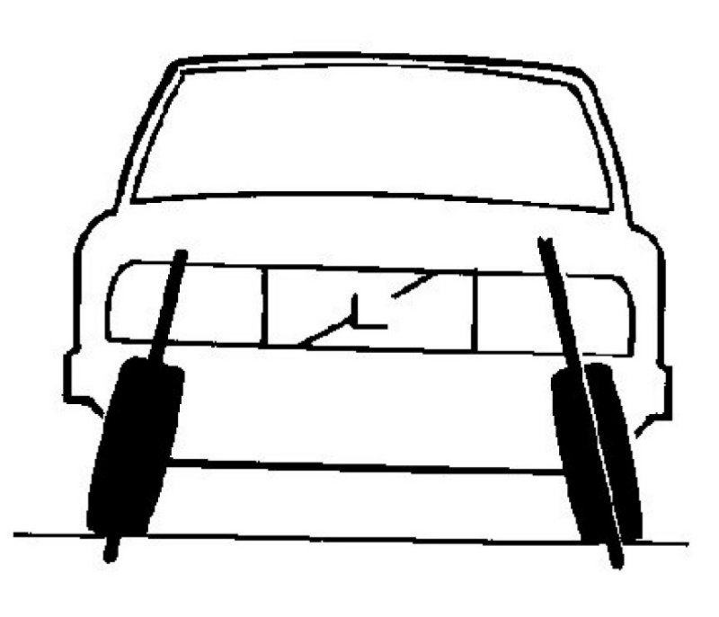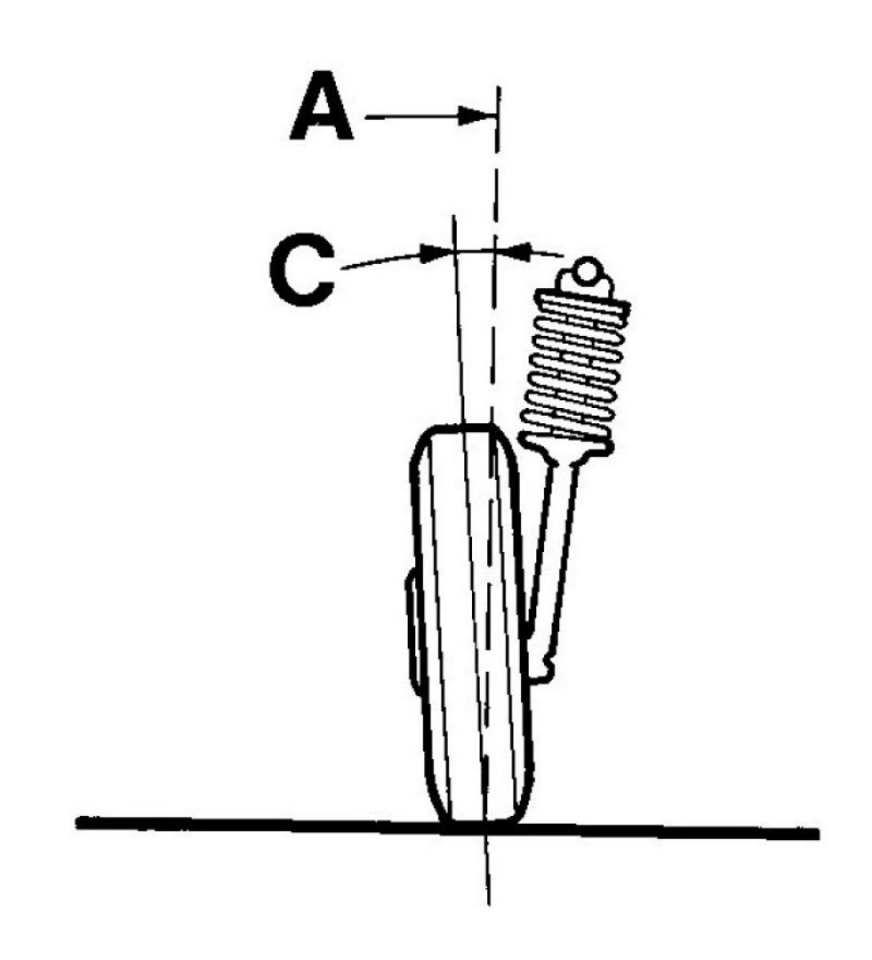 Camber (C) refers to the wheel leaning in or outwards. The angle is considered positive if the wheel leans outwards and negative if the wheel leans inwards.