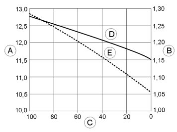 Example of the variation in the stand-by voltage and in the density of the acid with the state of charge in a battery(of open type) at +25°C (77°F) (measured after approx. 2 hours charging or discharging)