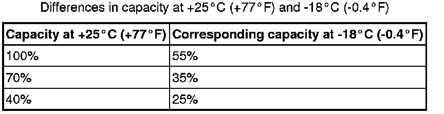 The table shows the difference in capacity in a battery at +25°C (+77°F) and -18°C (-0.4°F).